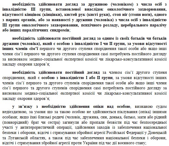 • Якщо є потреба у постійному догляді за хворою дружиною(чоловіком), чи батьками своїми чи другою половинки, проте стан здоров’я хворої людини повинен підтверджуватися висновком МСЕК чи ЛКК